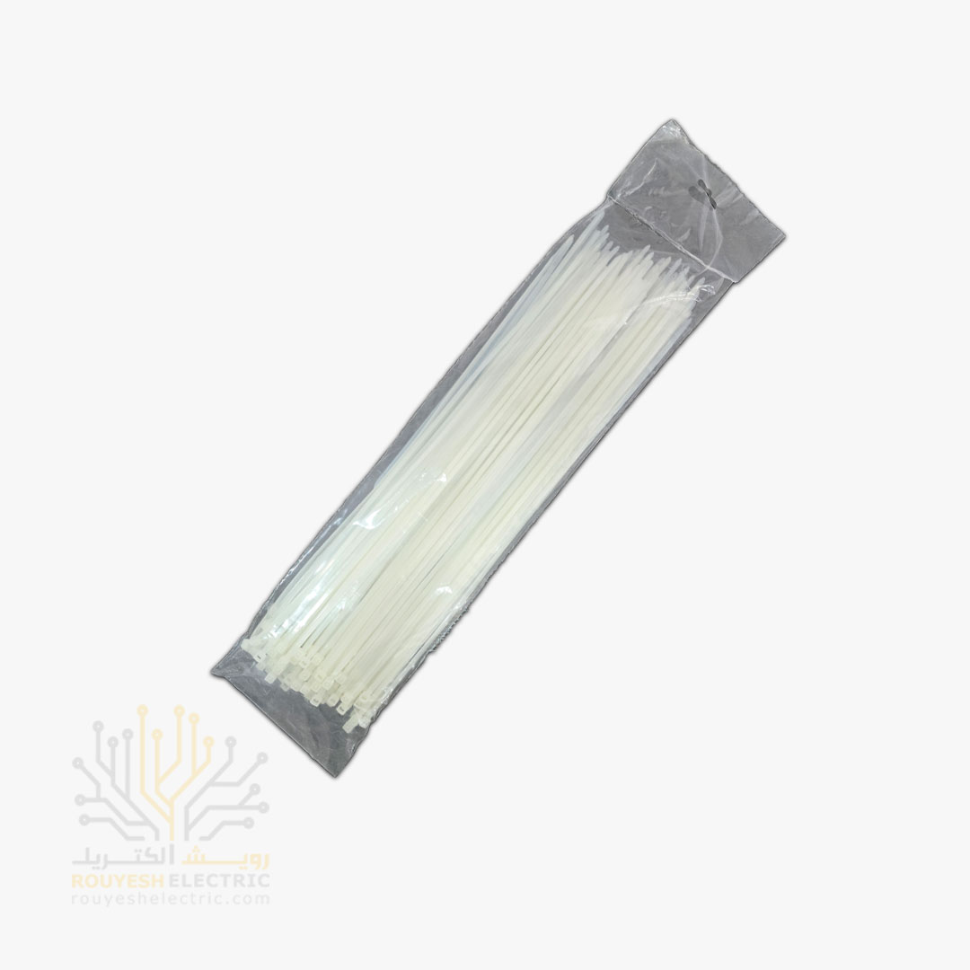 این بست کمربندی ظاهرش شبیه یه کمربند پلاستیکی باریکه. طولش حدود ۳۷ سانته و عرضش نزدیک به ۳.۶ میلیمتره. رنگش سفیده و جنس بدنهاش هم از پلاستیک ساخته شده. توی هر بسته که به صورت نایلونی عرضه میشه، ۱۰۰ عدد بست هست. حداقل خرید هم یه بستهست و اگه بخوای عمده بگیری، هر کارتن شامل ۱۰۰ بسته میشه.