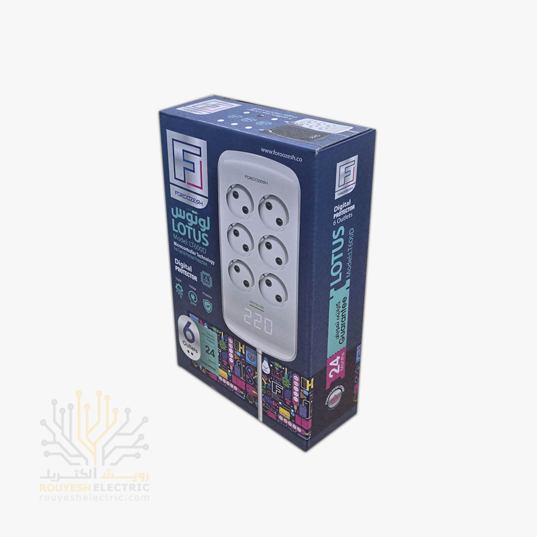 محافظ برق کامپیوتر سیار شش خانه برند فروزش مدل LT600D لوتوس بدون ارت بدون کلید بدنه سفید دیجیتال 2/8 متری