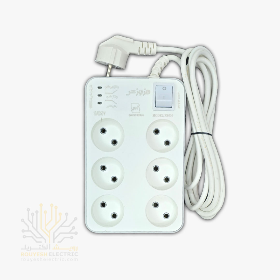 محافظ برق کامپیوتر سیار شش خانه برند فروزش مدل FR600 بدون ارت کلید دار بدنه سفید آنالوگ 2/8 متری