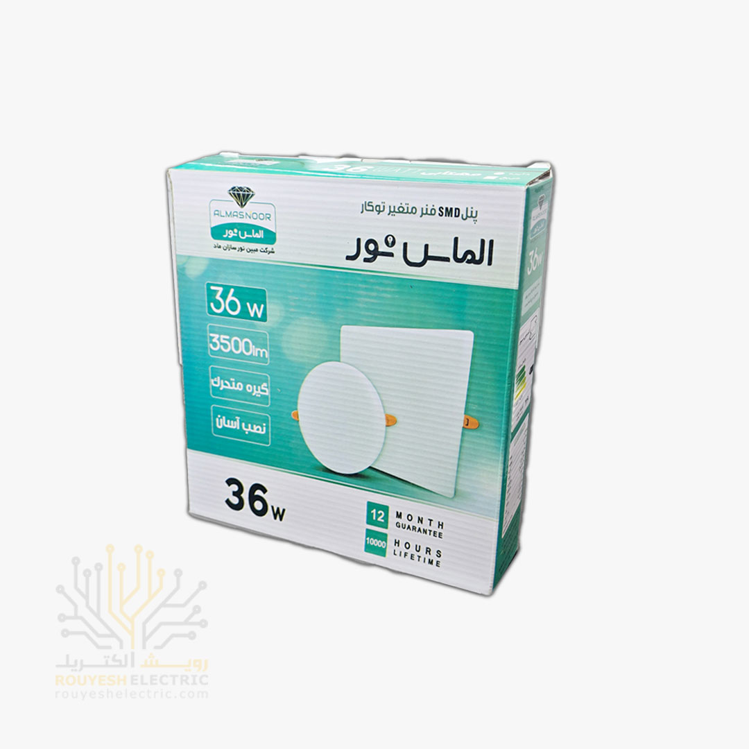پنل سقفی توکار 36وات برند الماس نور مدل فول لایت فنر متغیر دایره استاندارد رنگ مهتابی