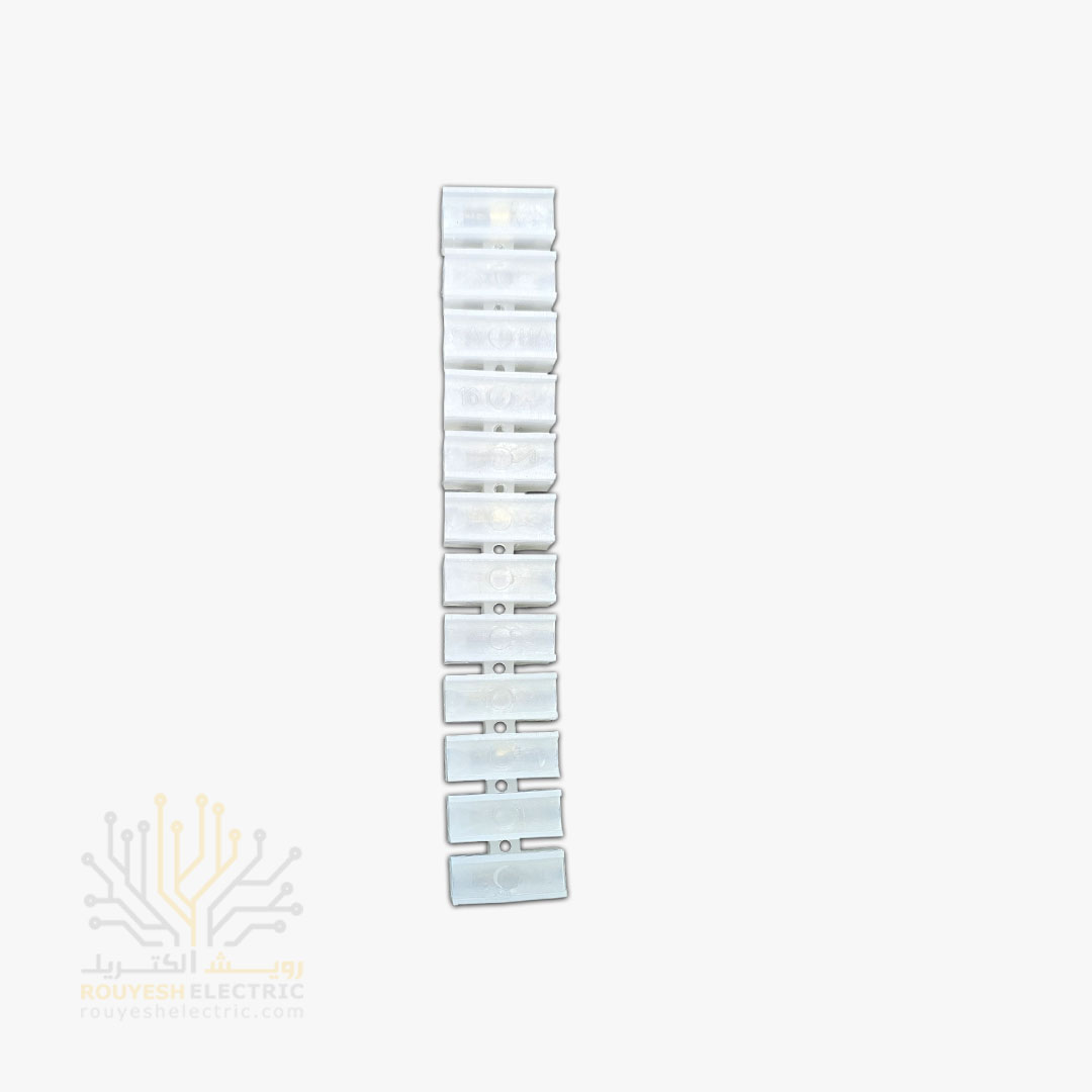 این ترمینال شکل مستطیلی داره و ظاهرش جمعوجور و خوشدسته. طولش حدود ۱۴.۵ سانته، عرضش ۲.۲ و ارتفاعش حدود ۲ سانت، یعنی نه خیلی بزرگه نه دستوپاگیر. بدنه از پلیاتیلن ساخته شده و چون بیرنگ و شفافه، داخلش و محل اتصال سیمها رو راحت میتونی ببینی. هر بسته شامل ۱۰ شاخهست که توی یه جعبه مقوایی مرتب بستهبندی شدن و هر کارتن هم ۲۰۰ بسته داره. کمترین مقدار سفارش ۱۰ شاخهست. این مدل ۱۲ تا سیمگیر داره که باعث میشه بتونی چند تا سیم رو خیلی مرتب و مطمئن به هم وصل کنی.