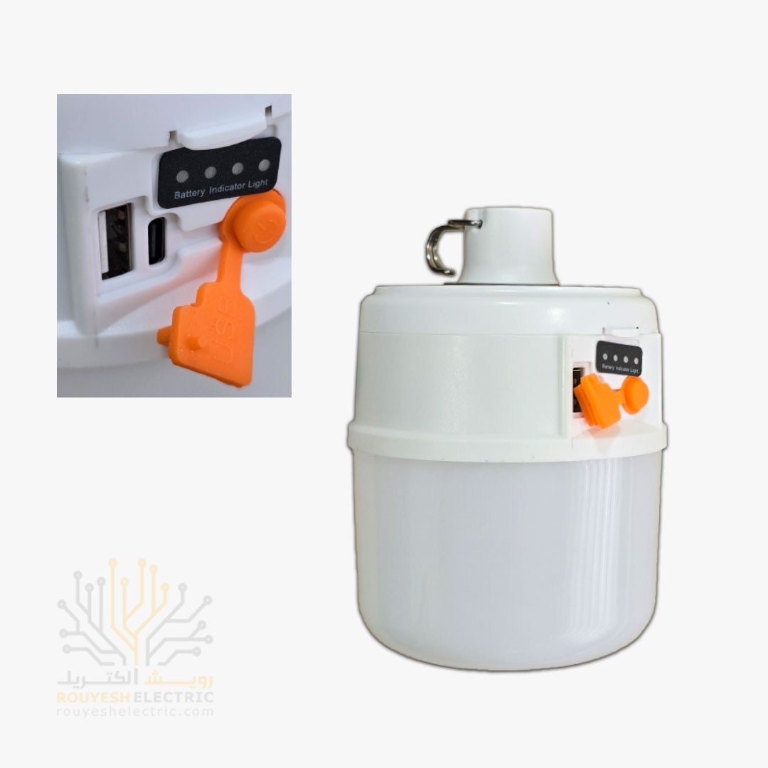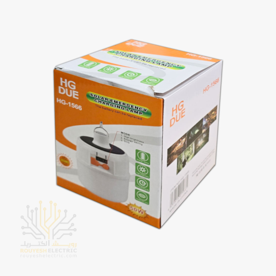 چراغ اضطراری لامپی 30 SMD برند HGDUE مدل HG-1566 طرح بالب 50 وات سه حالته دارای پنل خورشیدی گیره دار