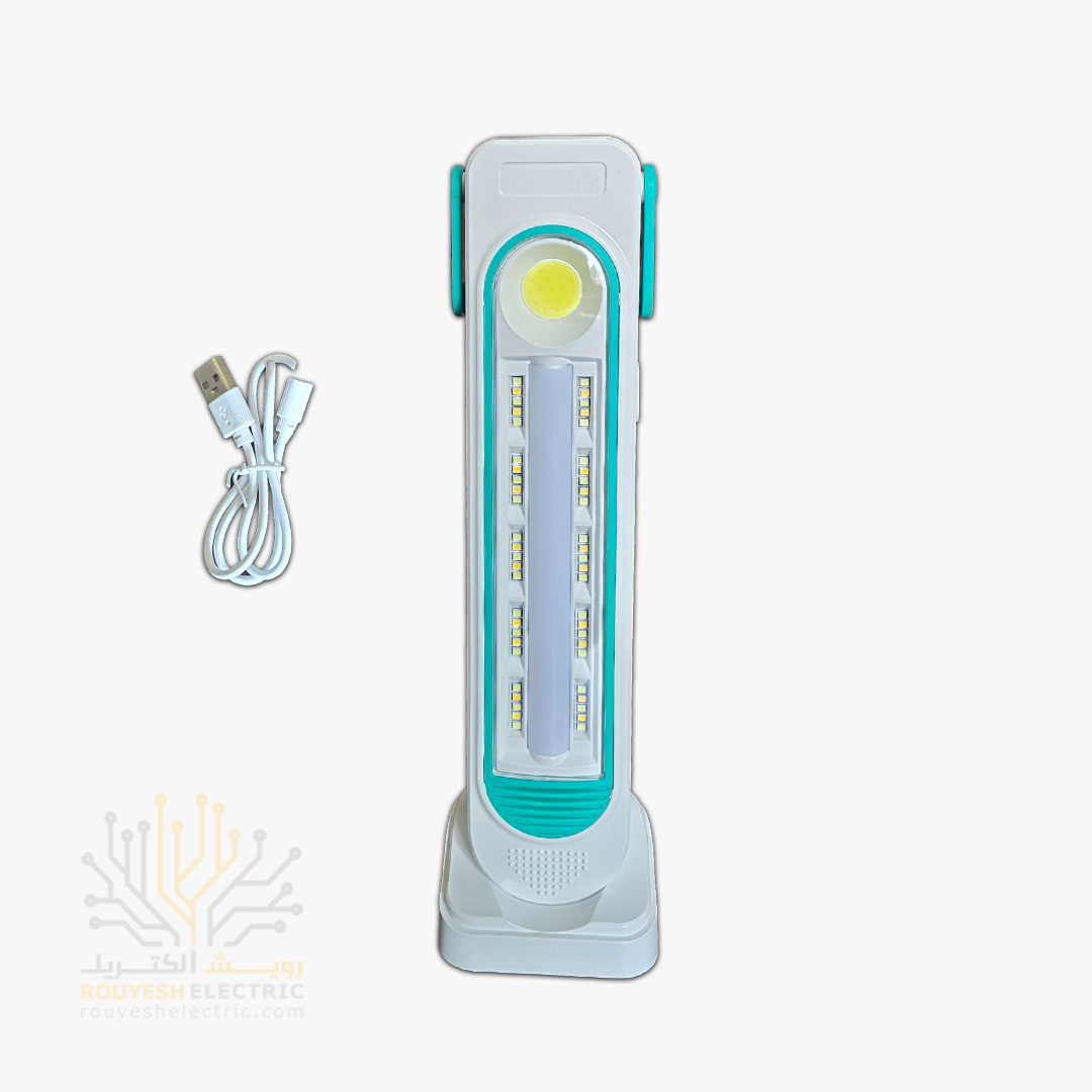 این چراغ مجهز به باتری داخلی با ظرفیت بالا است که از طریق دو روش شارژ میشود: پنل خورشیدی و پورت Type-C. پس از شارژ کامل، میتواند تا چند ساعت نوردهی مداوم داشته باشد. با بهرهگیری از ۵۰ عدد لامپ SMD LED، نور یکنواخت و قدرتمندی تولید میکند. سیستم نوردهی ۷ حالته شامل حالتهای مختلف نور سفید، زرد، ترکیبی، COB پرنور، COB ملایم است.