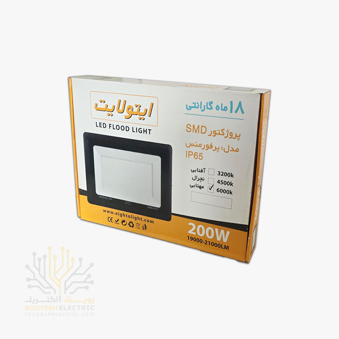 پروژکتور 200 وات SMD برند ایتولایت بدنه مشکی مهتابی موجود در شرکت رویش الکتریک ساخت کشور ایران می باشد. بدنه آلومینیوم، توان مصرفی ۲00 وات و شدت جریان آن حدود ۱.۲ آمپر است. درجه حفاظت IP66 و گارانتی ۱۲ تا ۲۴ ماه دارد. مزیتهای آن شامل مصرف کم انرژی و مقاومت در برابر هوا، مناسب برای فضاهای خارجی و دارای پایه قابل تنظیم می باشد.