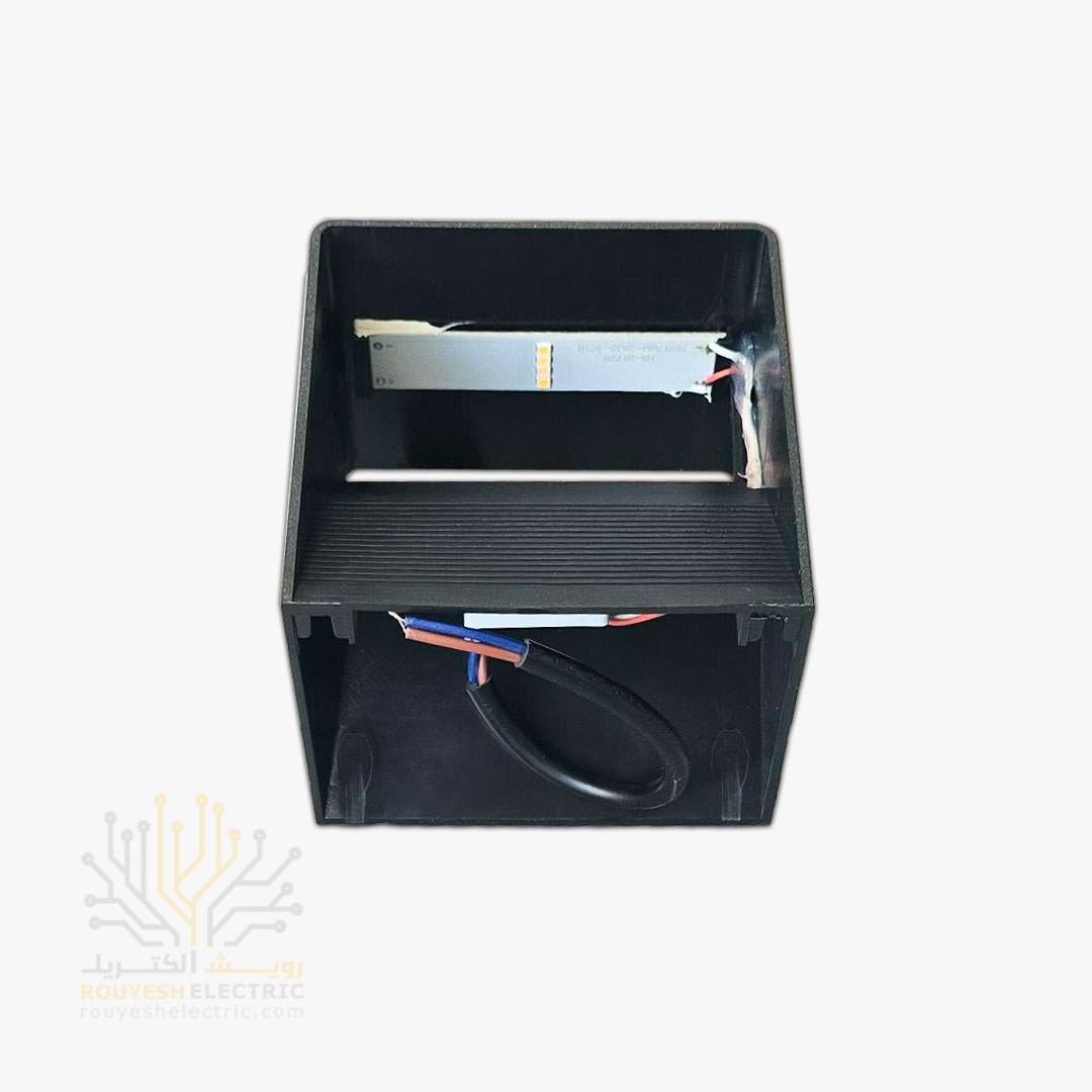 چراغ دیواری دکوراتیو 6 وات برند ایران مهر مدل کلبه ای یک طرفه کد ایران 50 بدنه مشکی نور آفتابی