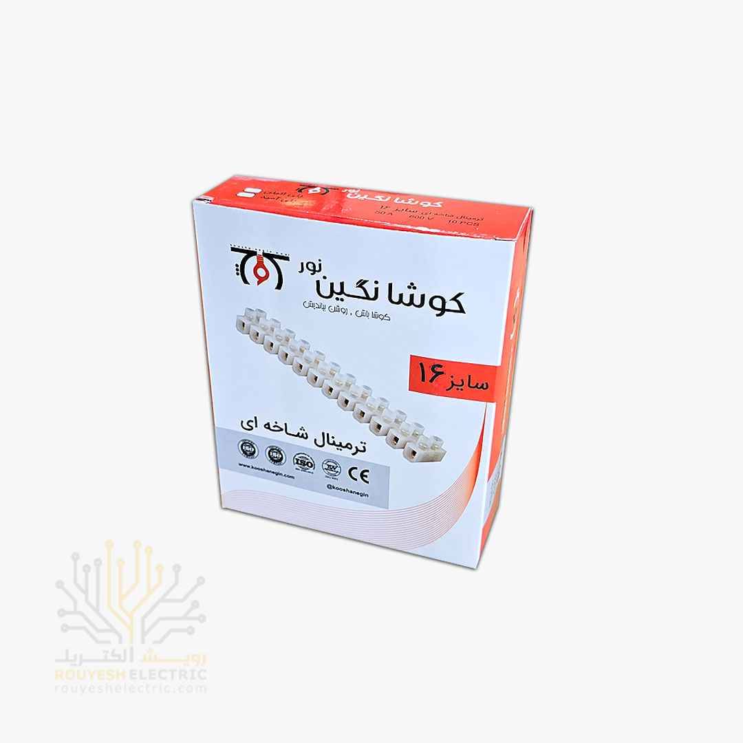 ترمینال نمره 16 پلاستیکی برند کوشا نگین، یک اتصالدهنده الکتریکی است که برای مدیریت و اتصال ایمن سیمهای برق با حداکثر سطح مقطع 16 میلیمتر مربع طراحی شده است. این محصول، دارای بدنهای از جنس پلاستیک عایق و مقاوم در برابر حرارت است و عدد “16” به حداکثر ظرفیت آن برای پذیرش سیم با این مقطع اشاره دارد.