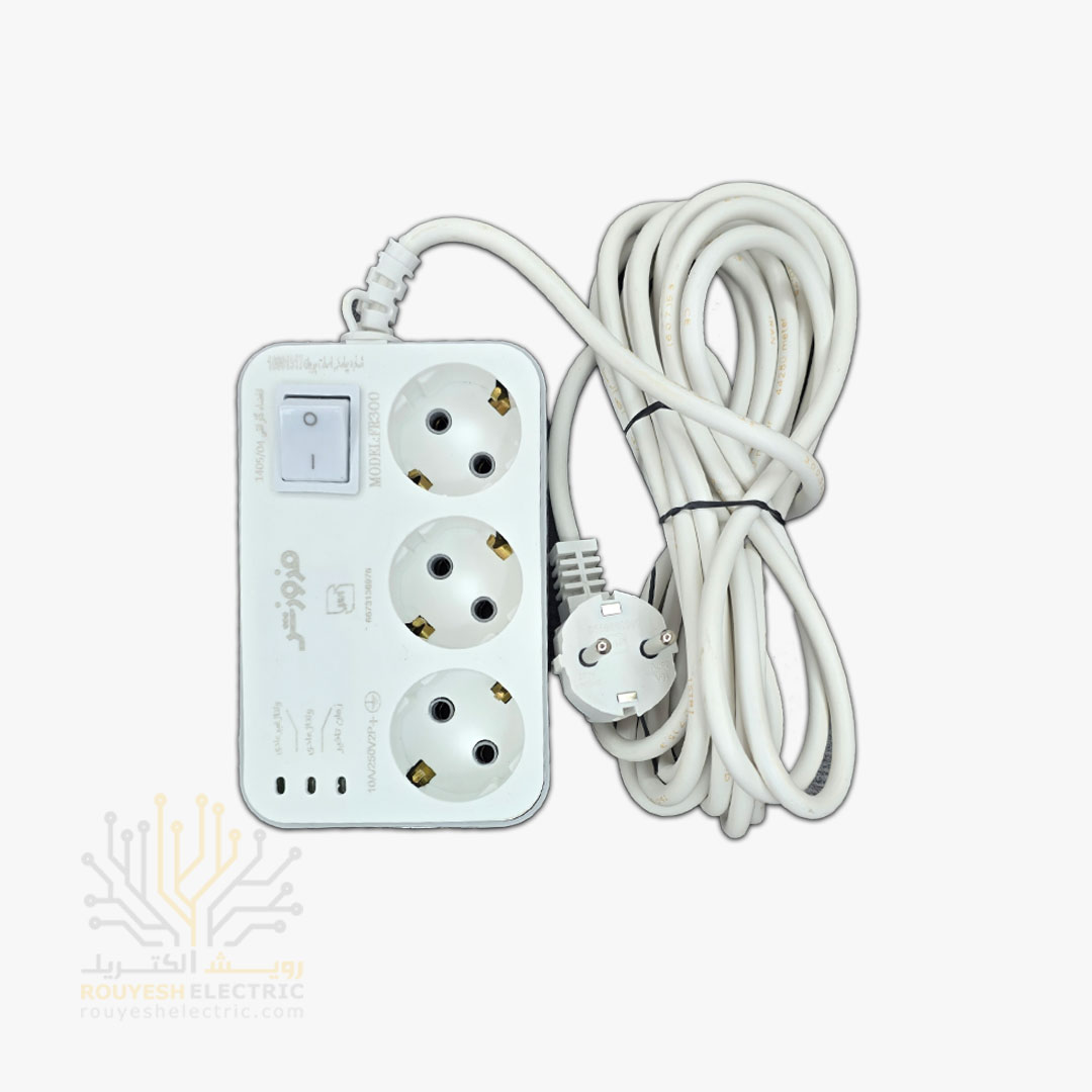 محافظ برق یخچال سیار سه خانه برند فروزش مدل FR300 ارتدار کلید دار بدنه سفید آنالوگ 4/8 متری