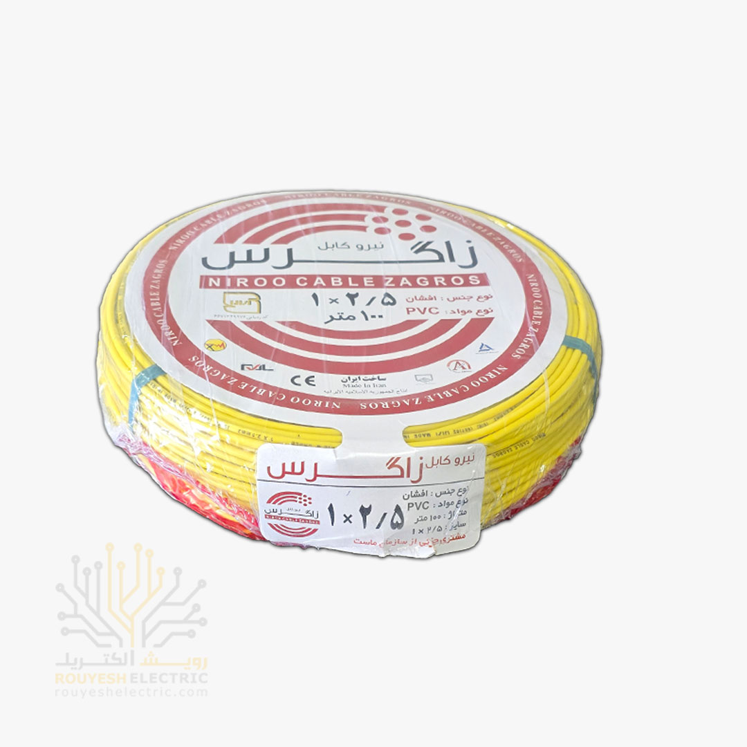 سیم افشان ۱×۲.۵ رنگ زرد نیرو کابل زاگرس یک سیم تکرشتهای با سطح مقطع ۲.۵ میلیمتر مربع است که با روکش PVC زردرنگ و مطابق با استاندارد ملی ایران تولید میشود. این سیم برای انتقال جریان برق در ولتاژ پایین و جریانهای نسبتاً بالا طراحی شده و در موارد زیر کاربرد دارد: