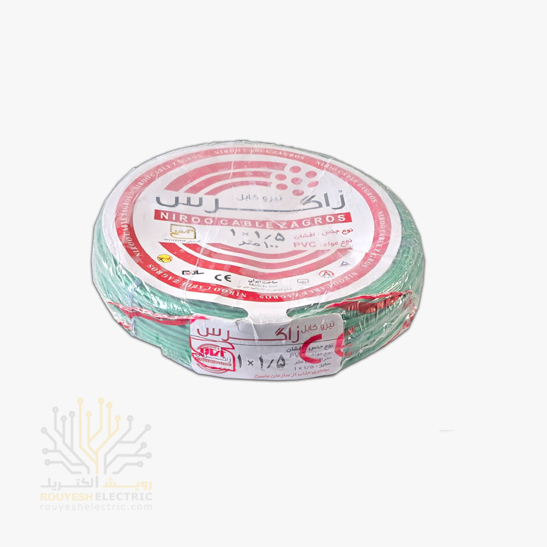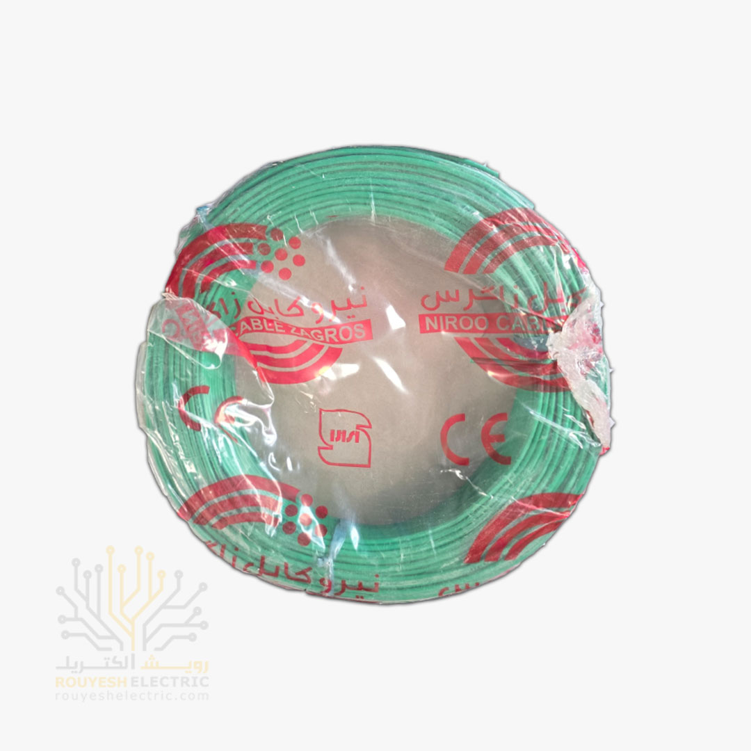 سیم برق نمره 1x1/5 برند نیرو کابل زاگرس استاندارد حلقه 100 متری رنگ سبز