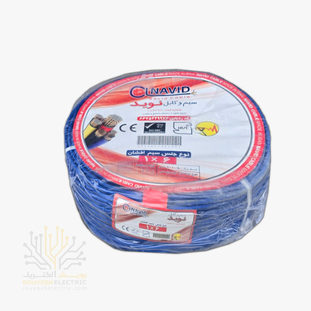سیم برق نمره 1x6 برند نوید استاندارد حلقه 100 متری رنگ آبی
