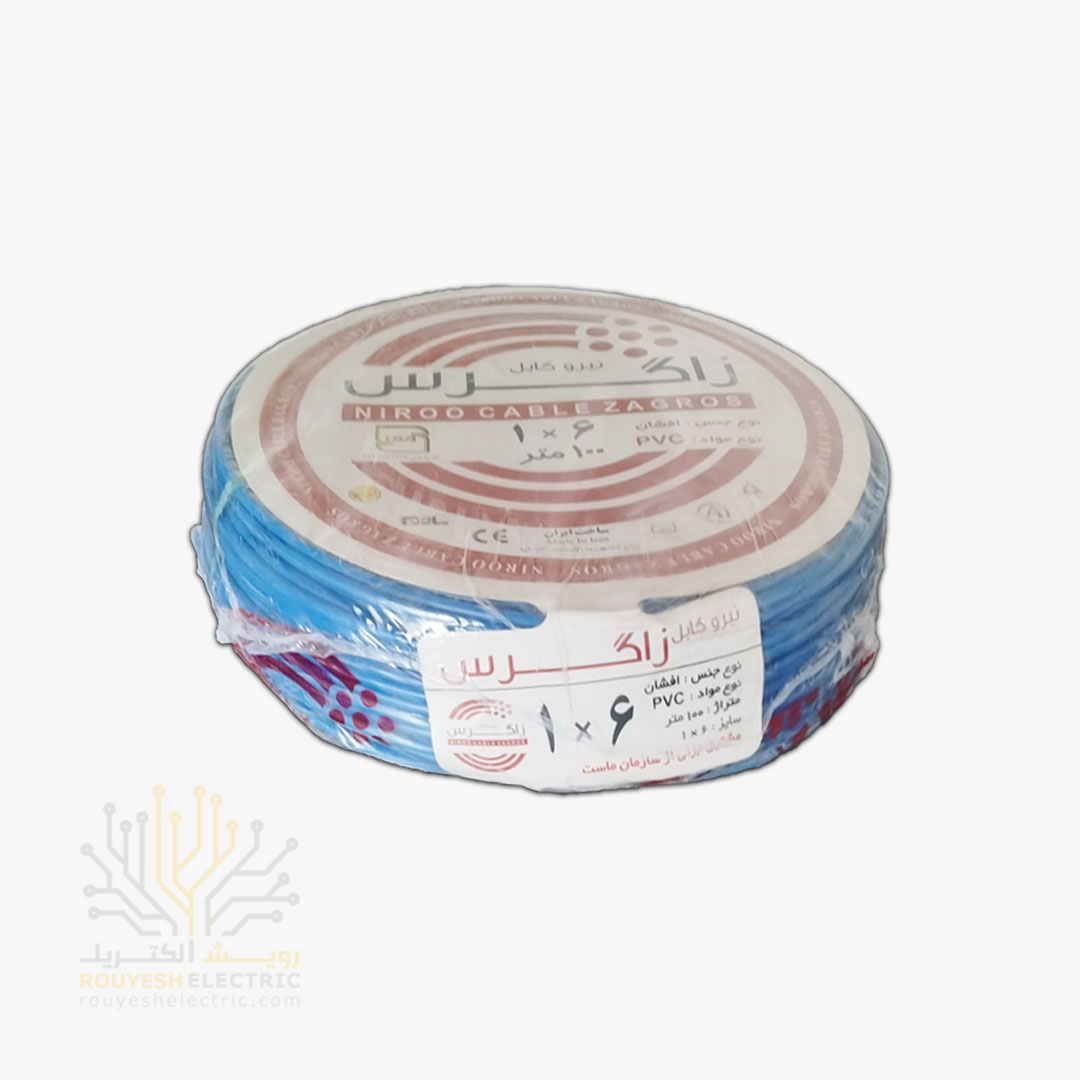 سیم برق نمره 1x6 برند نیرو کابل زاگرس استاندارد حلقه 100 متری رنگ آبی