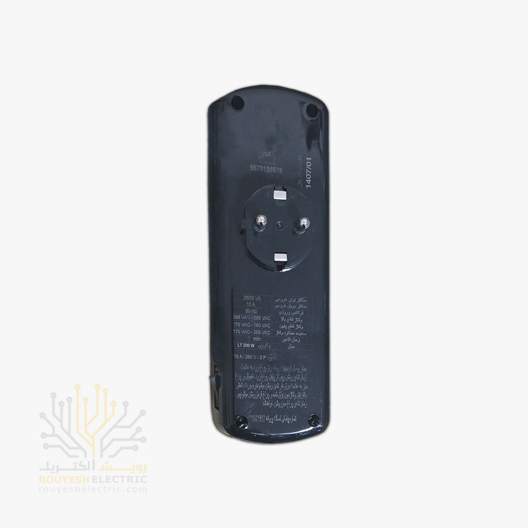 محافظ برق پکیج دیواری دو خانه برند فروزش مدل LT200W لوتوس ارتدار کلید دار بدنه مشکی آنالوگ