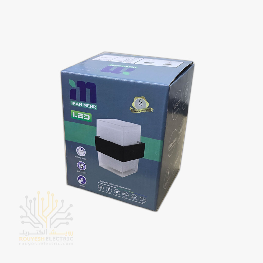 چراغ دیواری 12 وات برند ایران مهر مدل مکعب دو طرفه کد ایران 23 بدنه آلومینیوم مشکی یخی