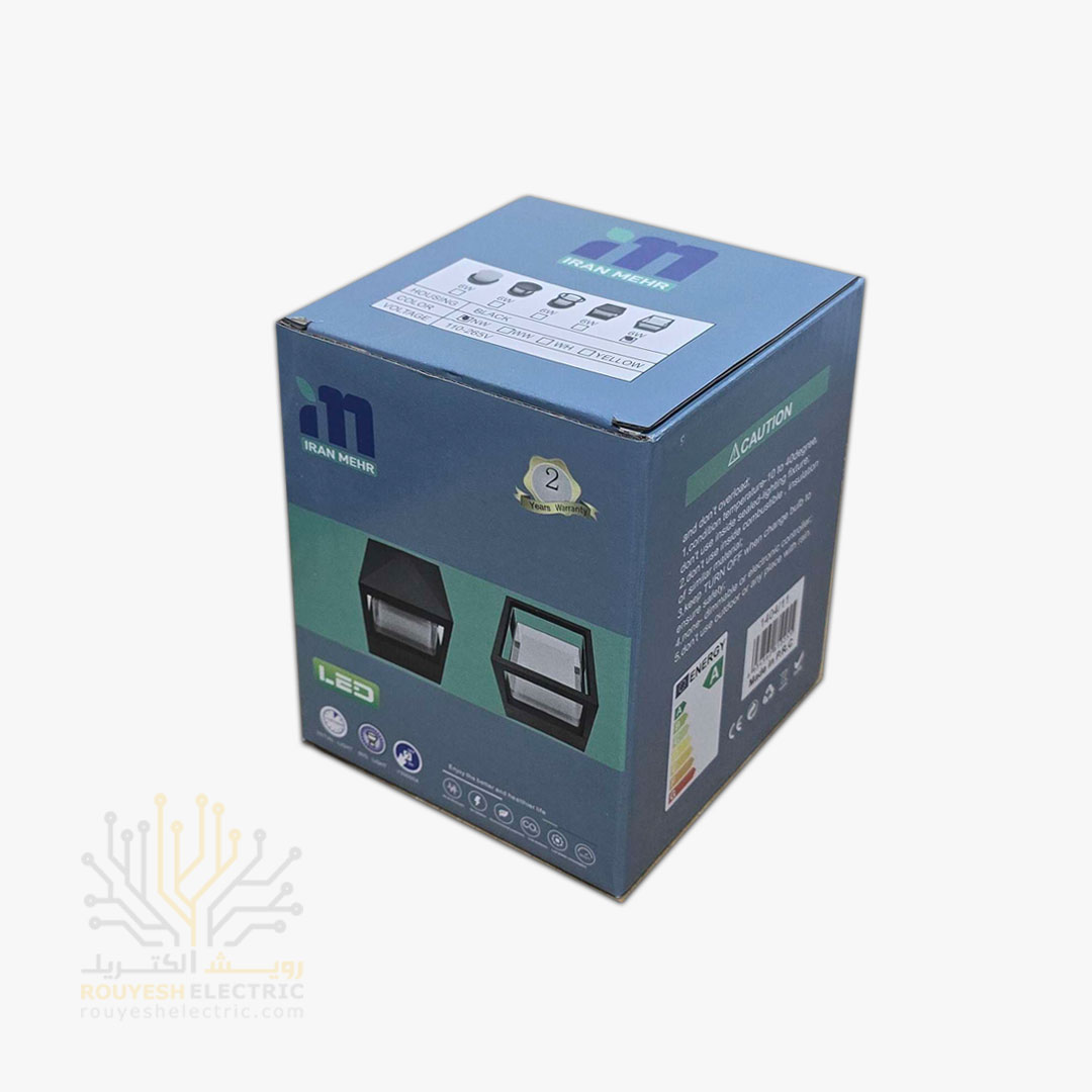 چراغ دیواری دکوراتیو 12 وات برند ایران مهر مدل مکعب دو طرفه کد ایران 23 بدنه مشکی نور نچرال 6 ماه گارانتی