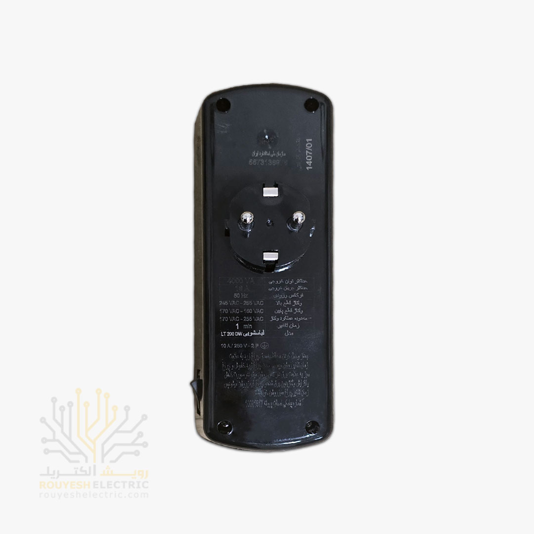 محافظ برق لباسشویی و ظرفشویی دیواری دو خانه برند فروزش مدل LT200 لوتوس ارتدار کلید دار بدنه مشکی دیجیتال